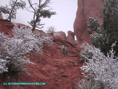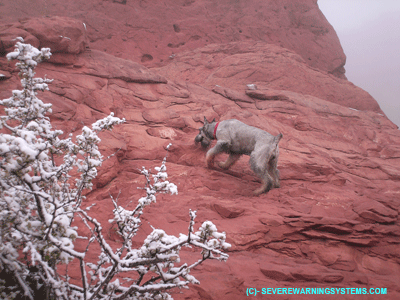 On a training mission.. It was a winter wonderland in the Garden of the Gods area of Colorado Springs. The (SWRV) journeys into the wilderness to document an early winter cold front. The mission was to continue the intense training of the search and rescue canine. Terra (the search and rescue canine) has logged over 90,000 miles since 2009 in a multitude of severe weather events in the (SWRV). She has been directly under tornadic circulation, 100 feet of a touchdown, extreme lightning, large hail, and diverse weather conditions ranging from 10 degrees to over 120 degrees.